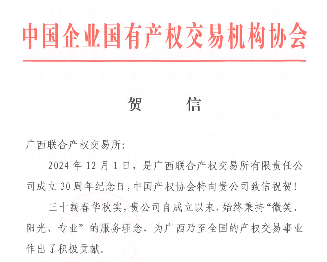 中國(guó)企業(yè)國(guó)有產(chǎn)權(quán)交易機(jī)構(gòu)協(xié)會(huì)致信祝賀廣西聯(lián)合產(chǎn)權(quán)交易所成立30周年